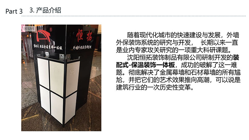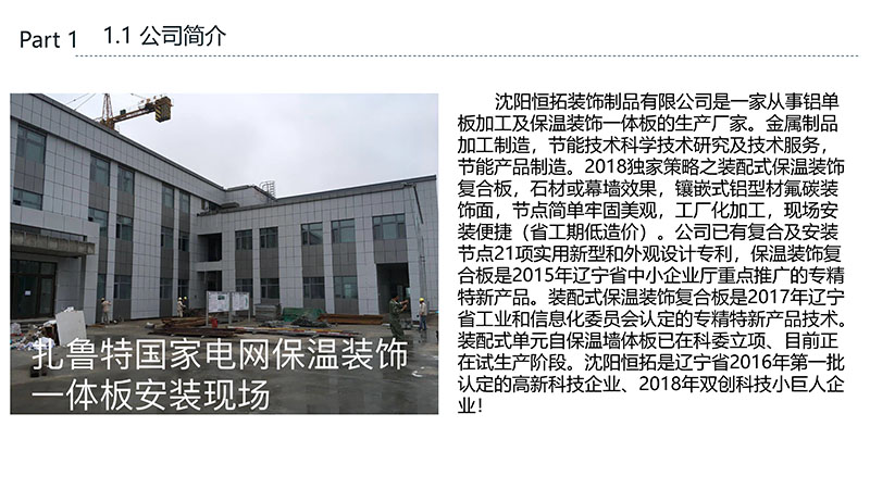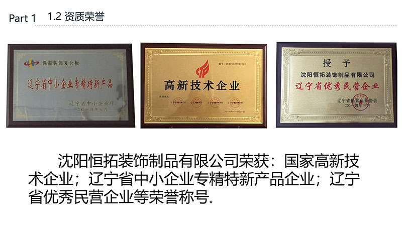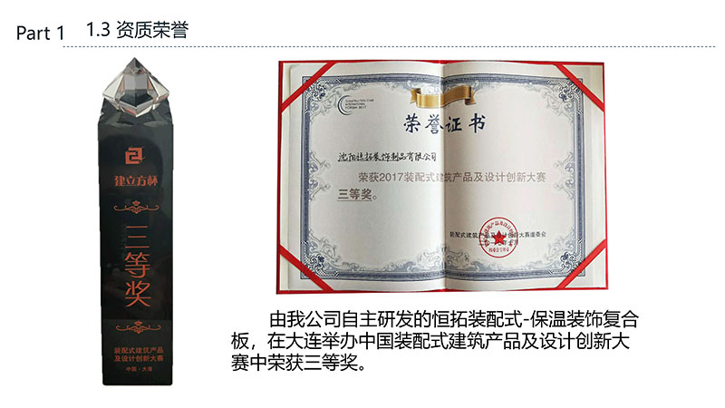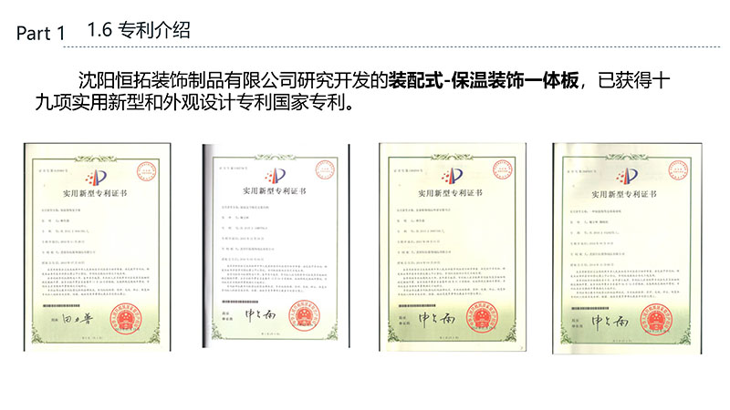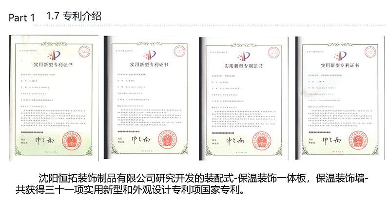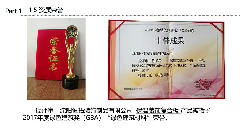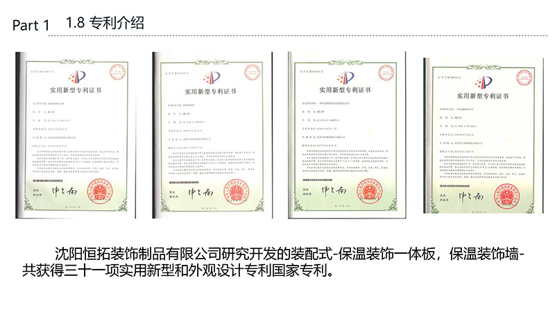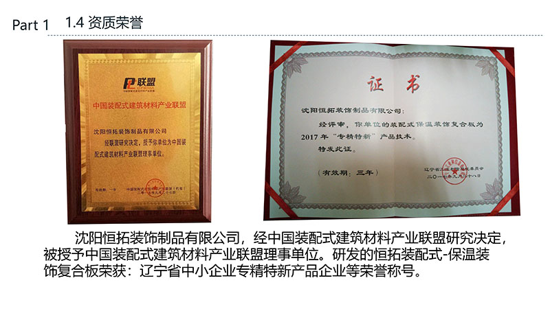 保溫裝飾一體化板的沈陽恒拓裝飾制品有限公司經(jīng)中國裝配式建筑材料產(chǎn)業(yè)聯(lián)盟研究決定,被授予中國裝配式建筑材料產(chǎn)業(yè)聯(lián)盟理事單位,研發(fā)的恒拓裝配式保溫裝飾復(fù)合板榮獲遼寧省中小企業(yè)專業(yè)特新產(chǎn)品企業(yè)等榮譽稱號。